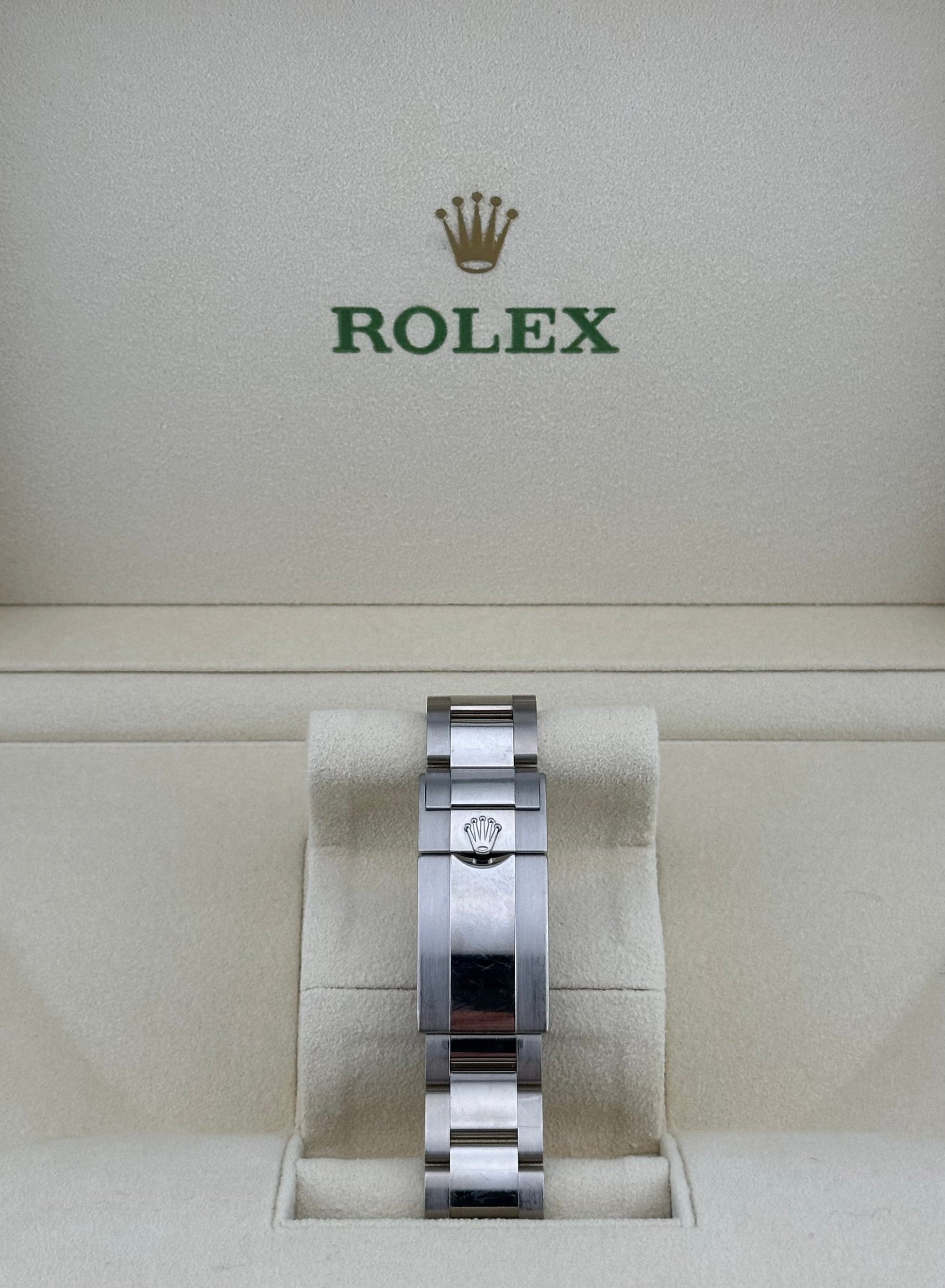This 2025 GMT-Master II watch is made of 40mm 18K white gold and is paired with an Oyster bracelet. Its complications include dual time zones and a 24-hour display. The hour hand and minute/second hand operate independently, allowing the wearer to easily adjust the time zone without affecting the 2025 watch's precise timing. The eye-catching red and blue bezel gave the 2025 watch the nickname "Pepsi". This watch is also available with a blue dial.