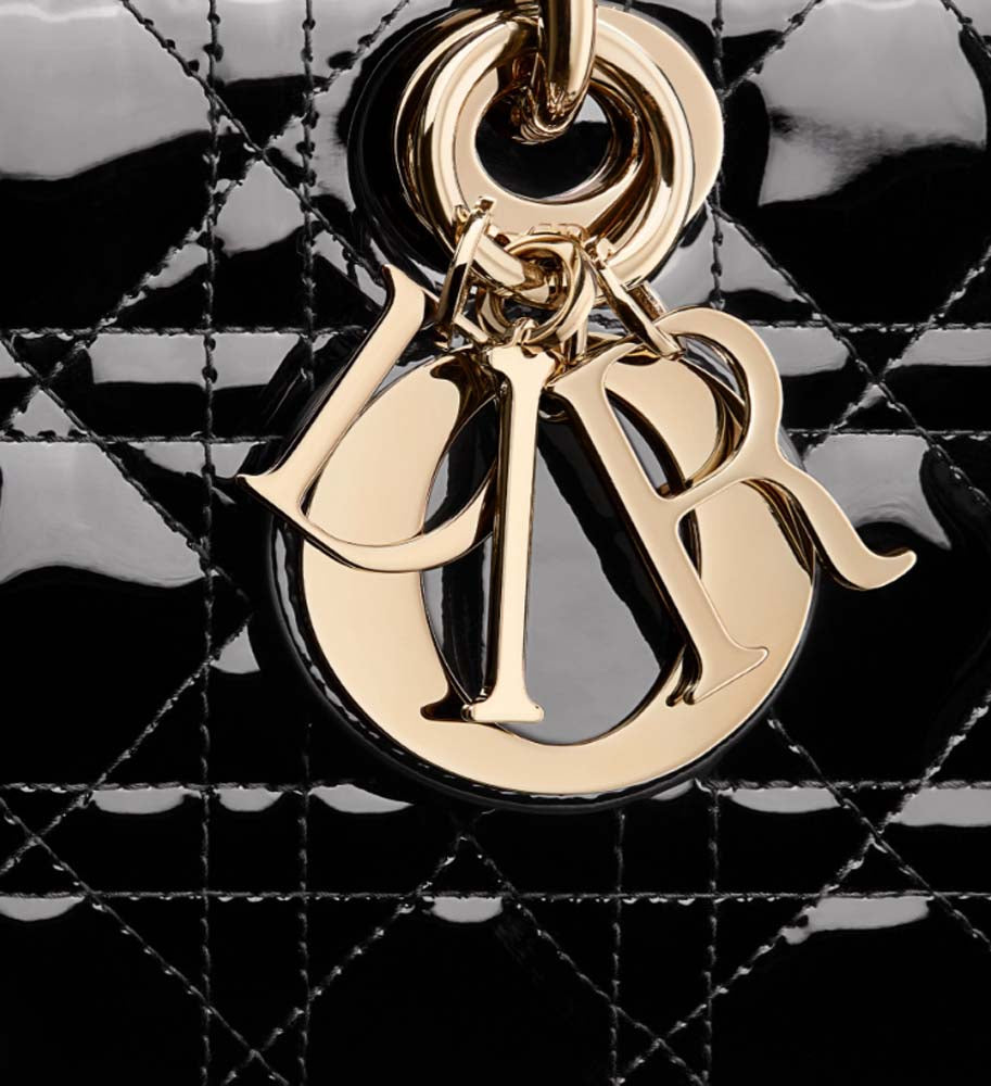 The Lady D-Joy bag captures the House's vision of elegance and beauty by showcasing the iconic streamlined aesthetic of the Lady D line. Crafted in black patent calfskin with Cannage stitching, the refined and timeless style is enhanced by pale gold-finish metal D.I.O.R. charms elegantly embellishing its silhouette. Featuring one removable chain strap and another adjustable and removable leather strap, the medium Lady D-Joy bag can be carried by hand, worn over the shoulder or crossbody as a daily companion.
